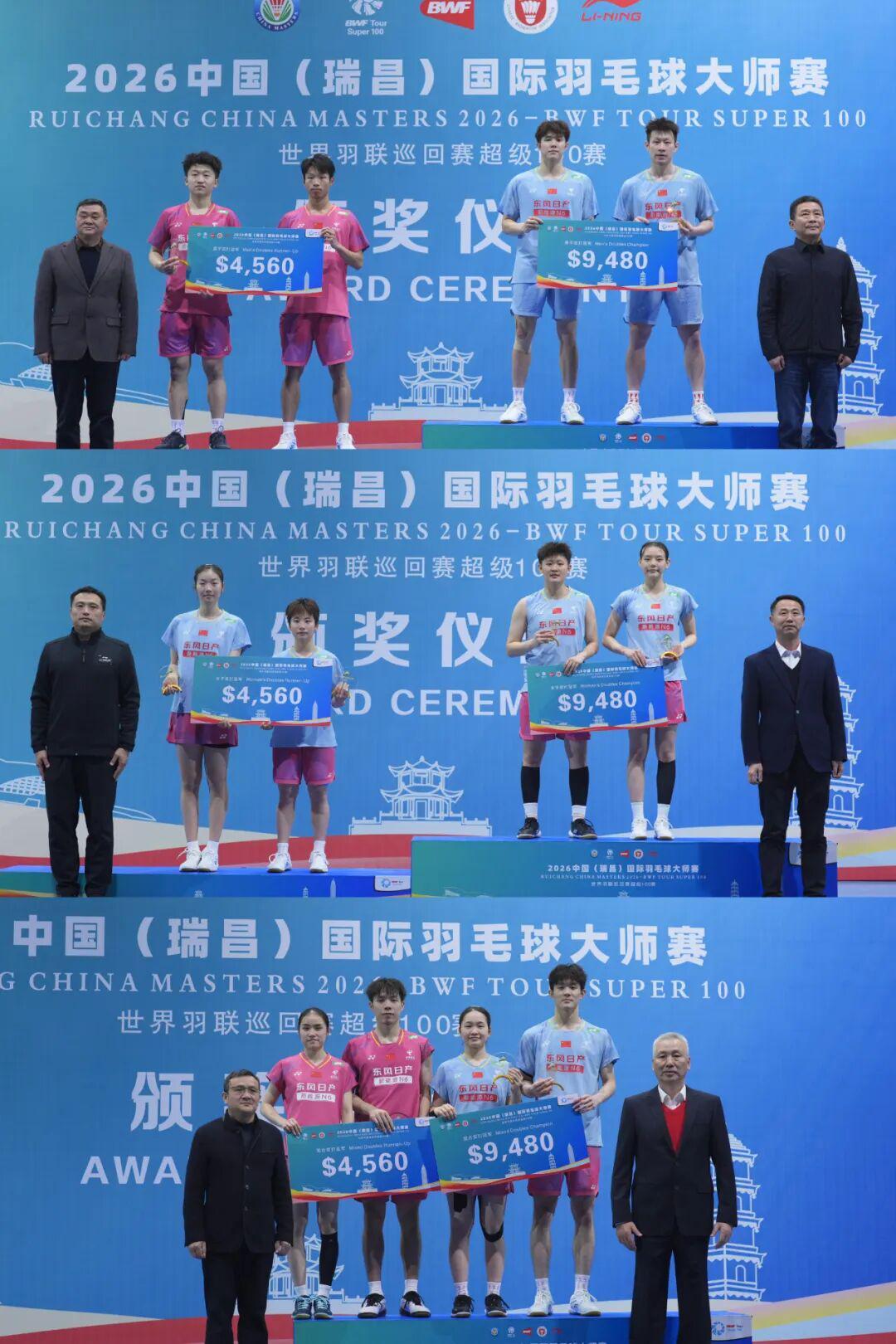 瑞士超级300赛与中国瑞昌超级100赛昨天同日结束争夺,中国羽毛球队在瑞士公开赛斩获女双和混双两个项目的冠军,且都是在决赛中实现会师;在瑞昌大师赛则包揽全部五项冠军。