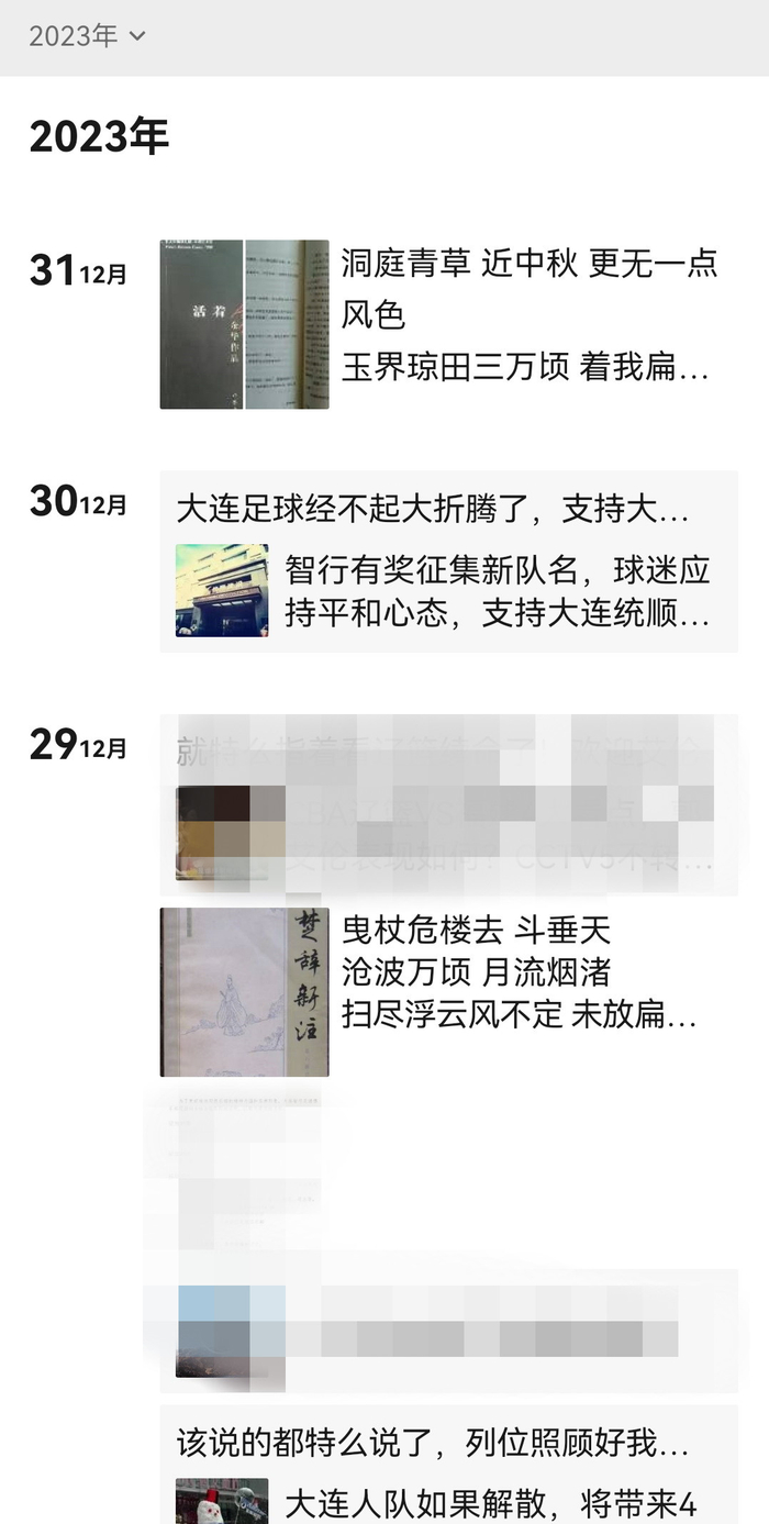 本人2023年12月下旬发的朋友圈,记录着自己为了让大连人队继续活着所做的努力。2023年12月31日,也就是那一年的最后一天,两位兄弟从市内来马桥额与我会面,说相关领导对我和大连球迷的心情十分理解,希望了解一下我的想法和诉求。我说看来大连人队是保不住了,一线队球员星散是我们无法左右的,但我希望能留住这几年深耕青训培养的各年龄段梯队的小球员,如果这些好苗子被抛到市场上,以大连智行(当时还没有更名为大连英博)的财力,根本无法跟各家中超中甲俱乐部竞争。另外,我希望能妥善安置各梯队教练团队和俱乐部工作人员。